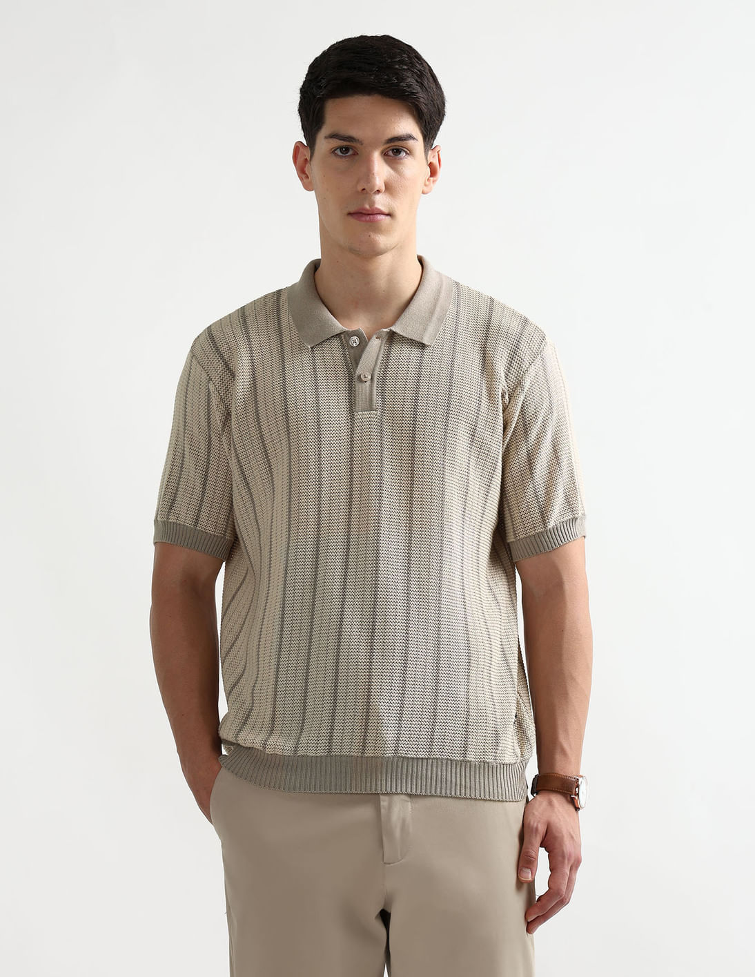 Textured Patterned Knit Relaxed Fit Polo Shirt