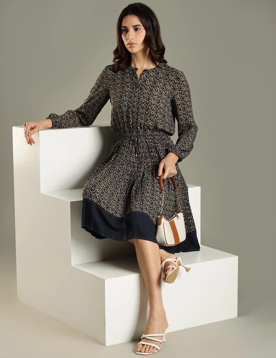 Polyester Band Collar A-Line Dress