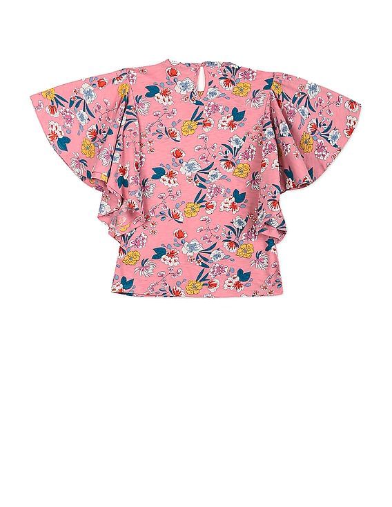 Girls Pink Butterfly Sleeve Printed Top