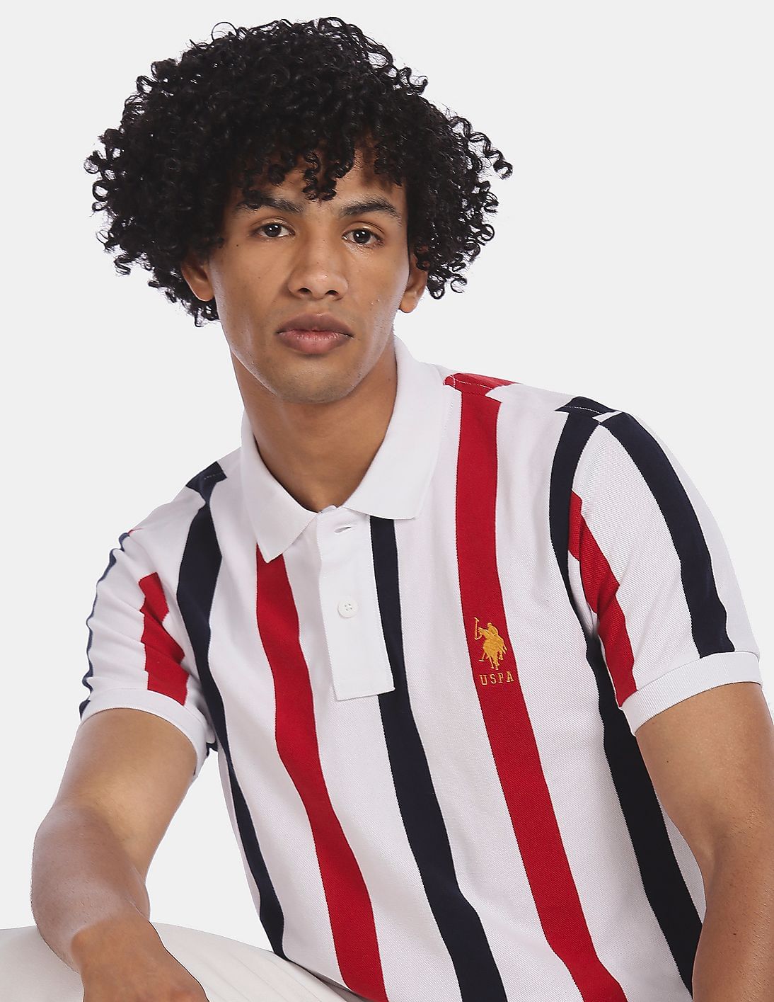 Men White Ribbed Collar Striped Pique Polo Shirt